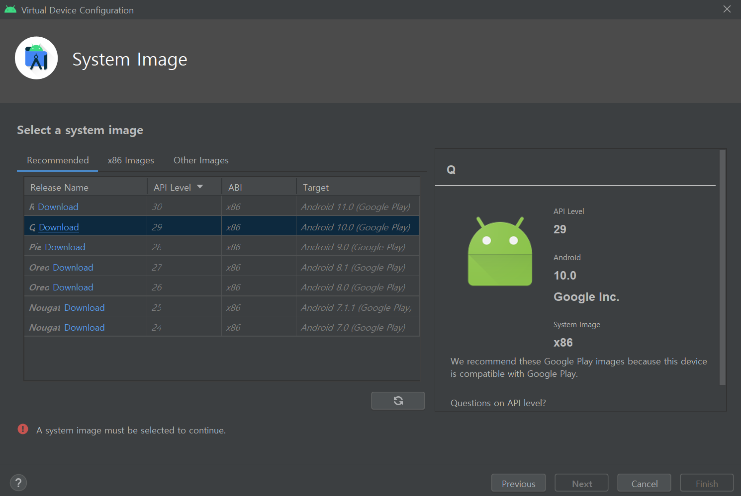 Android 10을 가장 많이 사용하기 때문에 2번째 클릭 후 Download. 다운로드하는 데 시간이 상당히 걸린다. (PC 사양에 따라 다름)