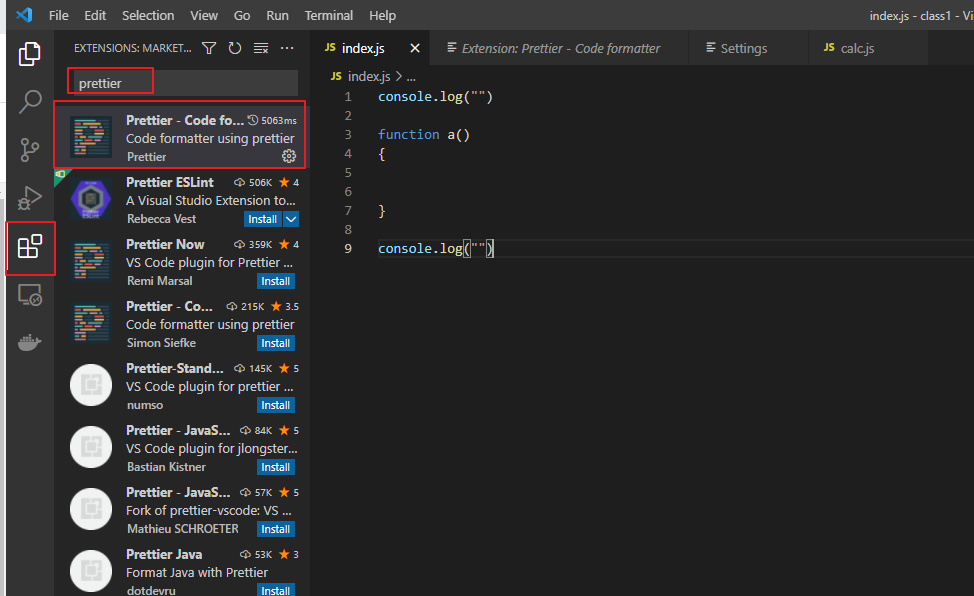 vscode 화면에서 왼쪽 아래에 확장프로그램 버튼을 클릭하고 검색창에 'prettier'를 검색한다.