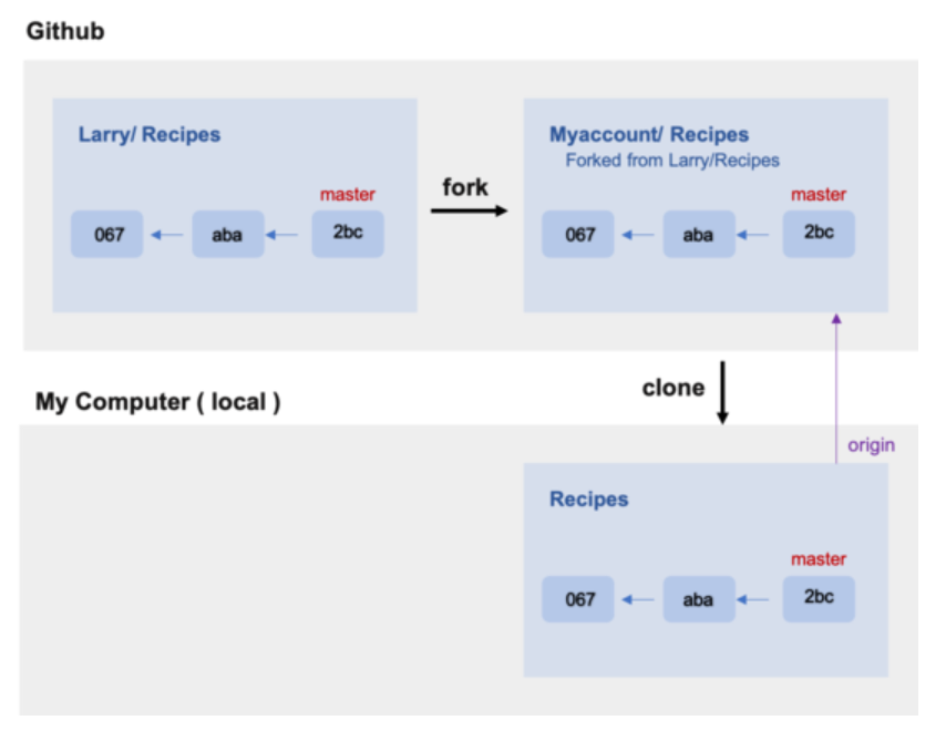 다른 사람의 Github Repository를 내 Github Repository로 그대로 복제하는 것이다. fork한 저장소는 원본 Repository와 연결되어 있다. (연결된 것은 Original Repository에 변화가 생기면 이는 그대로 forked된 Repository에 반영된다. 이 때 fetch나 rebase가 필요)