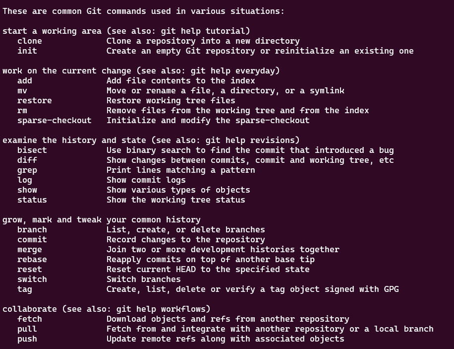파일들의 가능한 상태 확인 가능. 작업 디렉토리(working directory)와 스테이징 영역(staging area)의 상태를 확인하기 위해 사용