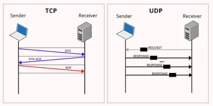 IP프로토콜에 PORT, checksum 필드 정보만 추가된 단순 프로토콜이다. 신뢰성이 낮으나, 3 way handshake를 사용하지 않기 때문에 빠른 속도를 보장하낟. HTTP3에서는 UDP를 사용하여 커스터마이징이 가능하다는 장점도 있다. + 실시간 스트리밍에 자주 사용