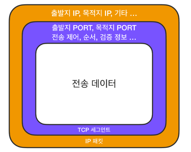 TCP 세그먼트에는 IP 패킷의 출발지 IP와 목적지 IP 정보를 보완할 수 있는 출발지 PORT, 목적지 PORT, 전송 제어, 순서, 검증 정보 등을 포함한다.
