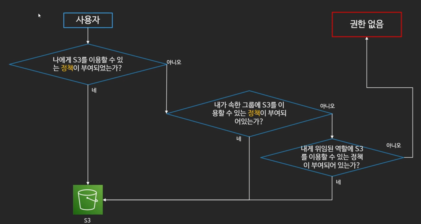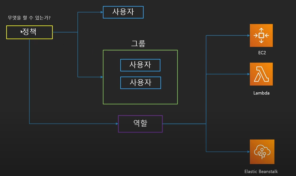| 정책(Policy) - 사용자와 그룹, 역할이 무엇을 할 수 있는지 정의 - JSON 형식으로 정의 |
