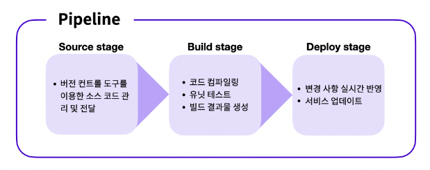 소스 코드의 관리부터 실제 서비스로의 배포 과정을 연결하는 구조를 파이프라인이라고 한다. 파이프라인은 전체 배포 과정에서 여러 단계로 분리한다.