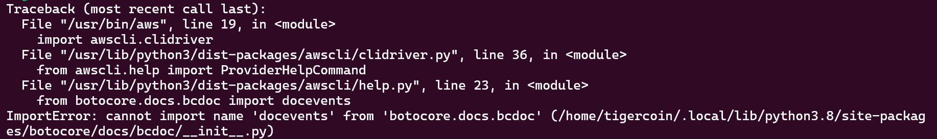 To Solve ImportError: cannot import name 'docevents' from 'botocore.docs.bcdoc' Error You need to reinstall awscli. First of all, update your
