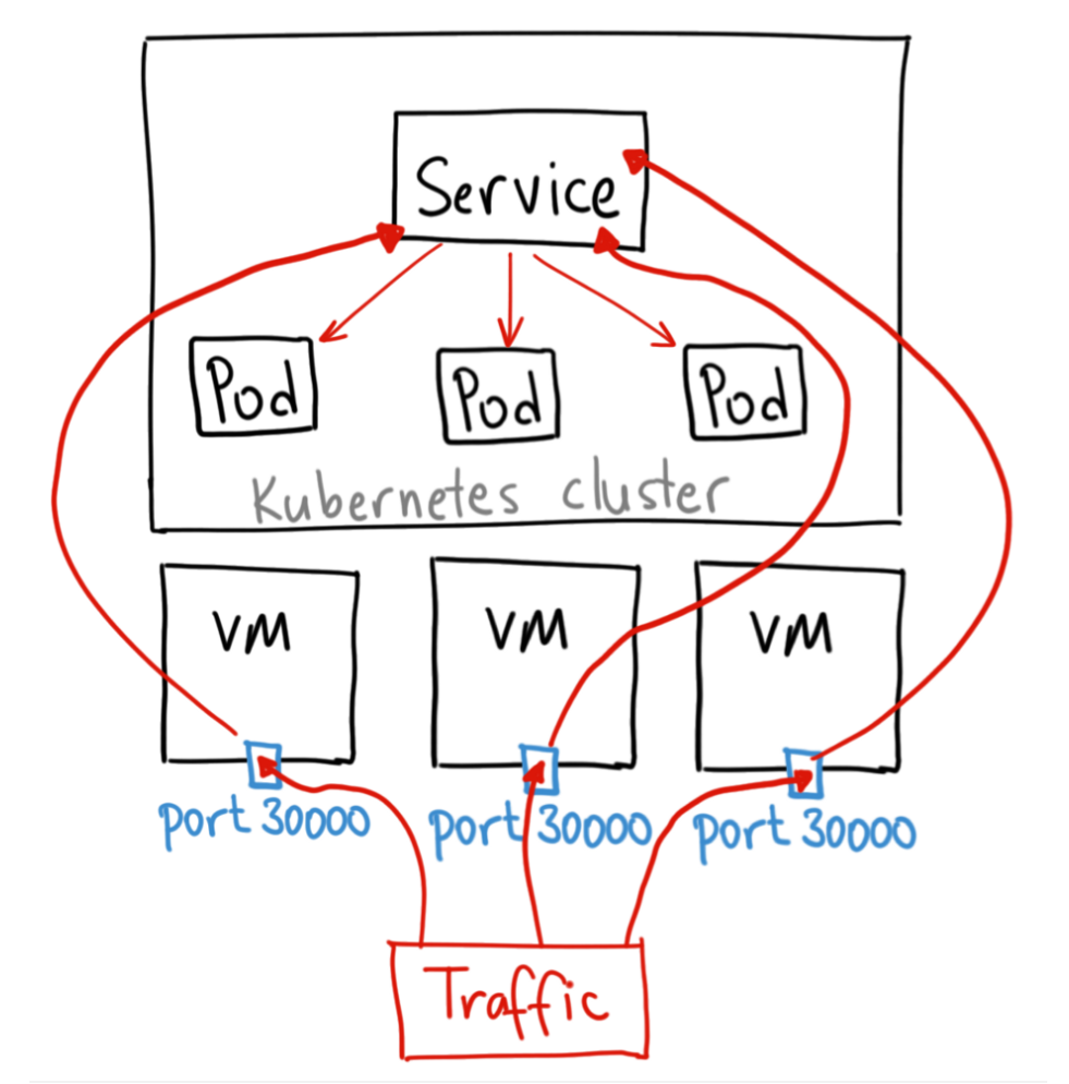 클러스터의 모든 노드로 외부에서 접근할 수 있는 포트를 개방한다. NodePort가 설정되면 {클러스터 임의 노드 IP} : {지정 포트번호}