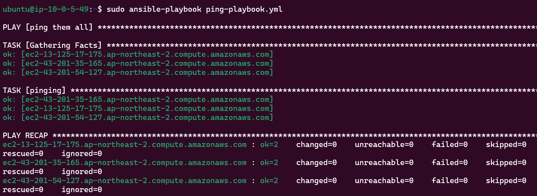 ansible-playbook으로 실행하면 아래와같이 ping 테스트가 성공적으로 뜬다.