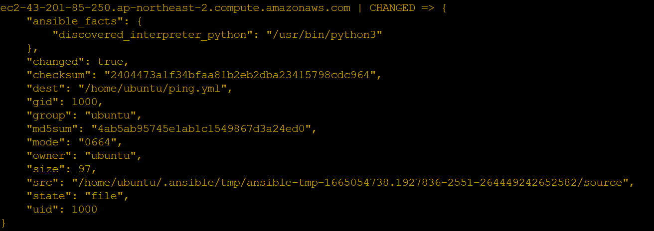 $ ansible all -m copy -a "src=ping.yml dest=/home/ubuntu/"
