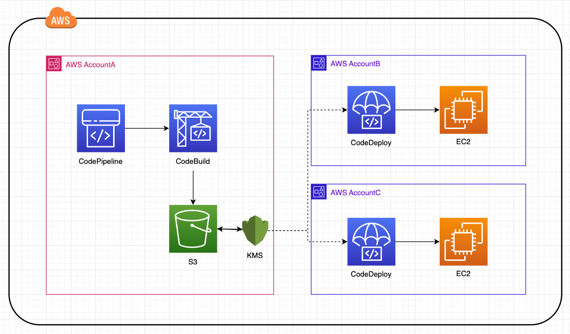 이를 위해 Account, 리소스 간 연결을 위한 Role 생성과 리소스의 데이터 보호에 사용되는 KMS를 통해서 AccountA의 CodePipeline을 중심으로 AccountB, AccountC에 배포할 수 있는 위 아키텍처를 구성한다.