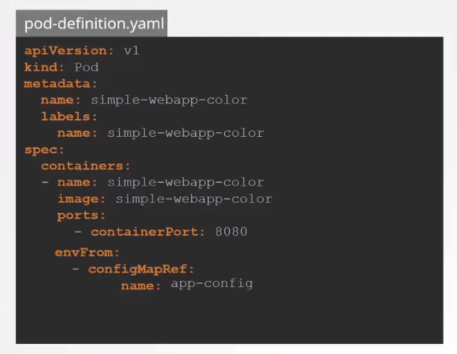 적용할 Pod에서 spec.containers.envFrom.configMapRef.name에 해당하는 configmap의 metadata 이름을 입력하면 관련 key, value가 모두 적용된다.