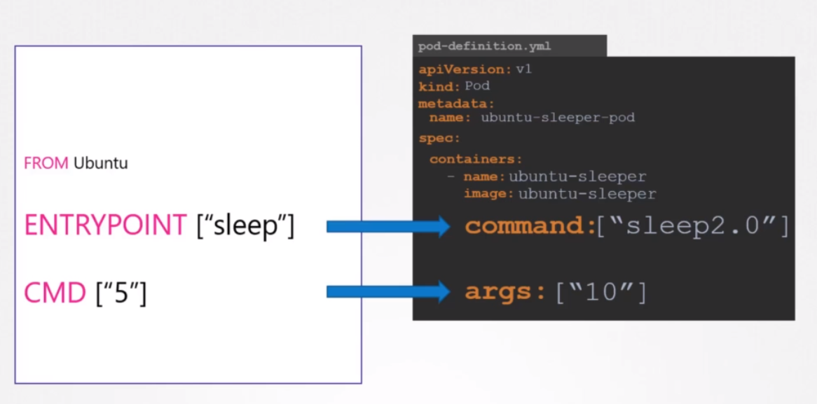 도커를 실행할 때, ENTRYPOINT와 CMD를 활용해서 명령어의 인자값을 컨테이너 실행시에 전달하고 수정할 수 있다. 쿠버네티스에서도 Pod 정의에서 활용이가능하다.