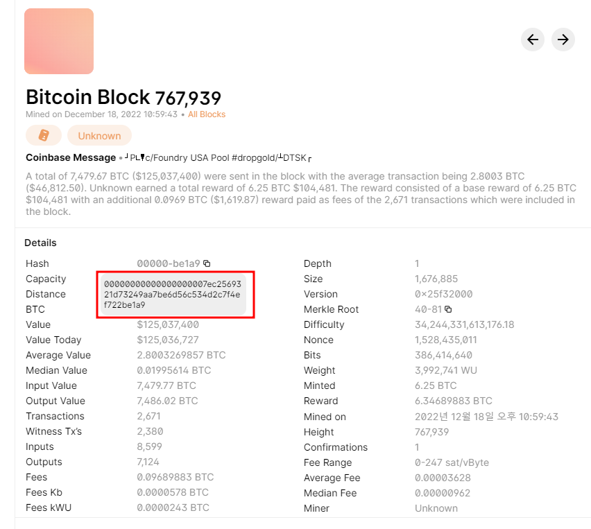 실제 비트코인의 767,939 블록을 보면 블록 hash 값이 "00000000000000000007ec2569321d73249aa7be6d56c534d2c7f4ef722be1a9" 으로 블록 난이도가 아주 높다는 것을 추정할 수 있다.