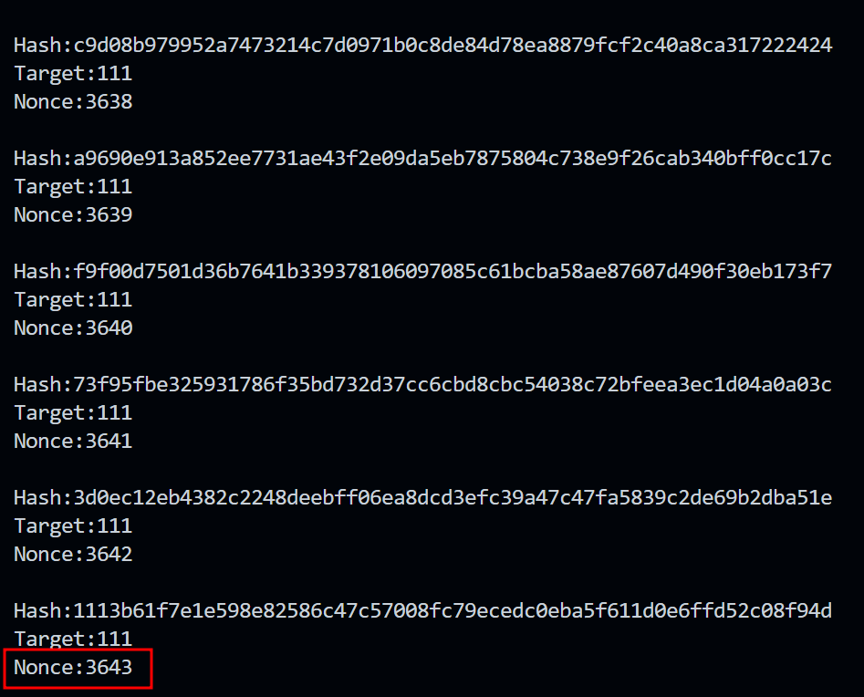 fmt.Printf("Hash:%s\nTarget:%s\nNonce:%d\n\n", hash, target, nonce)