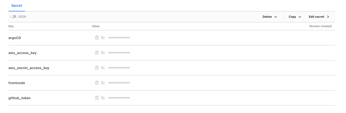 Repo에는 VAULT의 접근 인증을 위한 VAULT_URL, VAULT_TOKEN, VAULT_CA_CERT 를 제외하고는 나머지 config 파일과 token, key 값 모두 vault의 kv 시크릿으로 저장된다.