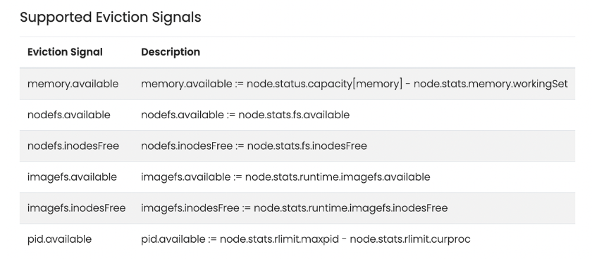 - Eviction Thresholds : kubelet은 evction thresholds를 지원하는데, 노드에 충분한 리소스가 유지될 때 시스템 데몬과 다른 시스템이 안정적으로 작동하기 위해서 pod를 제거한다. 여기서 kubelet은 hard, soft evction 두 가지 방식으로 eviction을 실행한다.hard 방식.spec.kubeletConfiguration.evictionHard은 조건에 부합하면 즉시 evict하는 것이고, soft 방식.spec.kubeletConfiguration.evictionSoft은 pod가 우아하게? 제거되도록 기회, 시간을 준다.