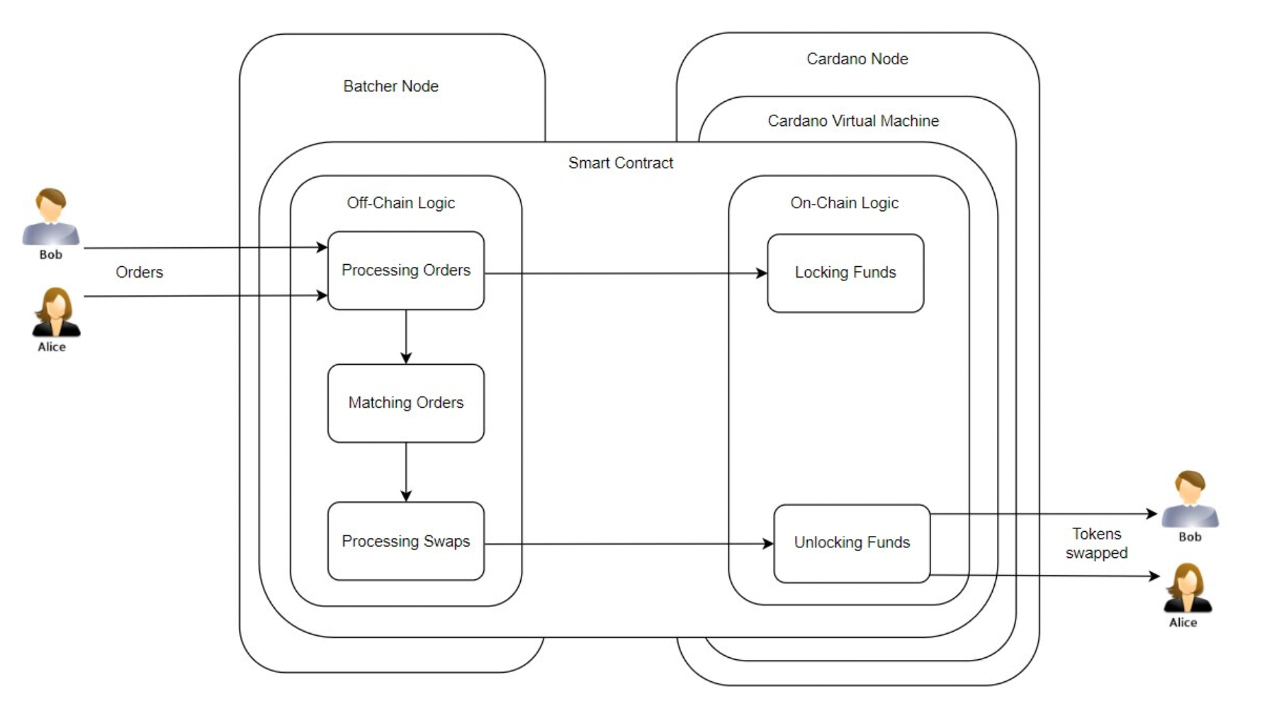 3) Batcher가 선택되면 Alice와 Bob이 거래에 사용할 자산이 락업된다. (스왑은 Batcher가 해당 자산을 컨트롤할 수 있는 경우에만 가능)