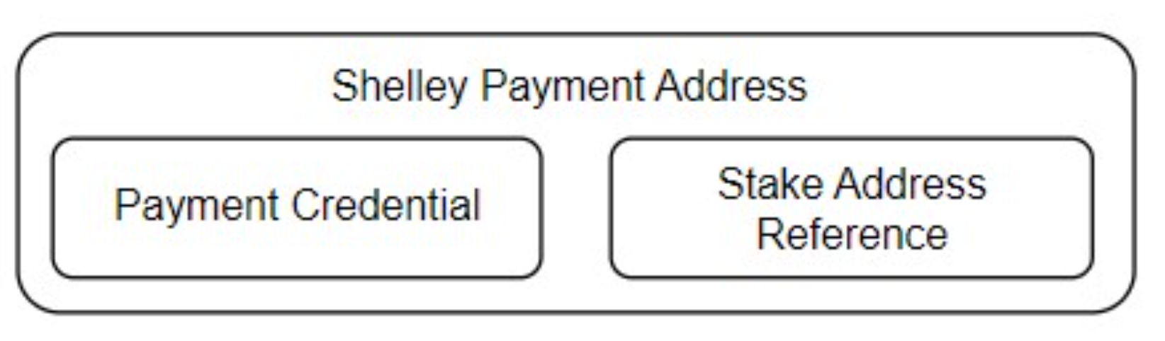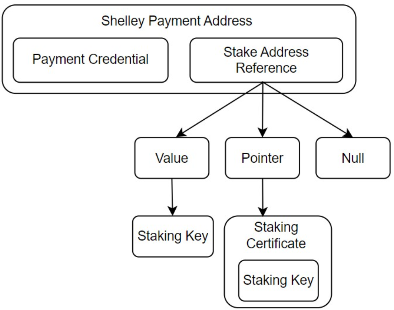 Shelly payment 주소의 Stake address reference에는 value와, 검증키의 hash(staking key) 또는 validator script가 포함될 수 있다.