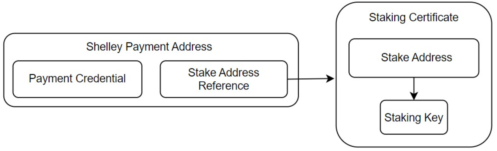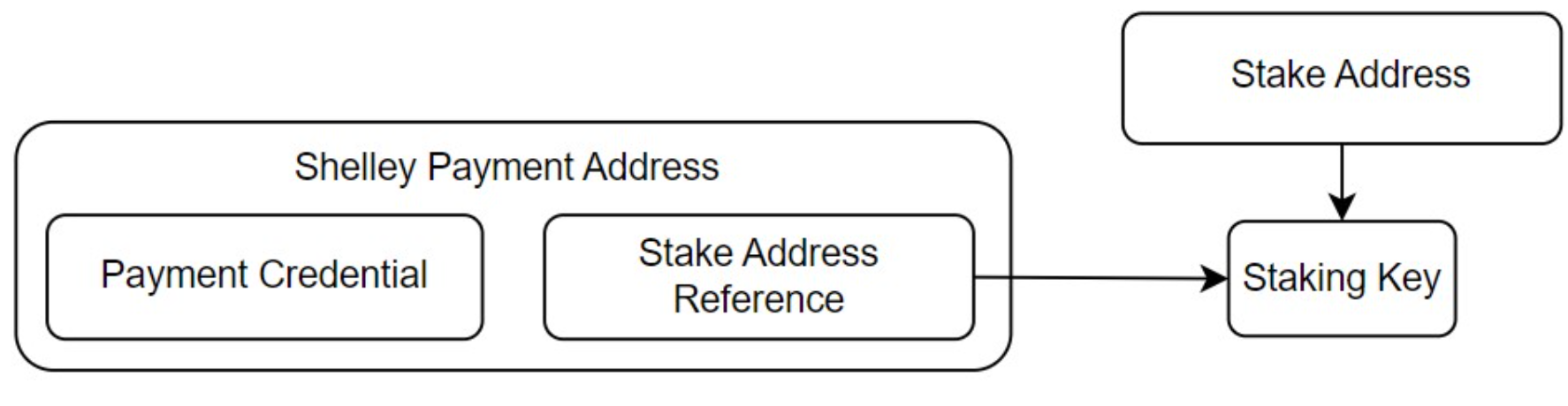 ADA는 항상 Payment address에 속한다. 각 Payment address는 선택적으로 Stake address를 참조할 수 있다. Payment address에 있는 모든 ADA의 스테이킹 권한은 이 Stake address와 연관되어있다.