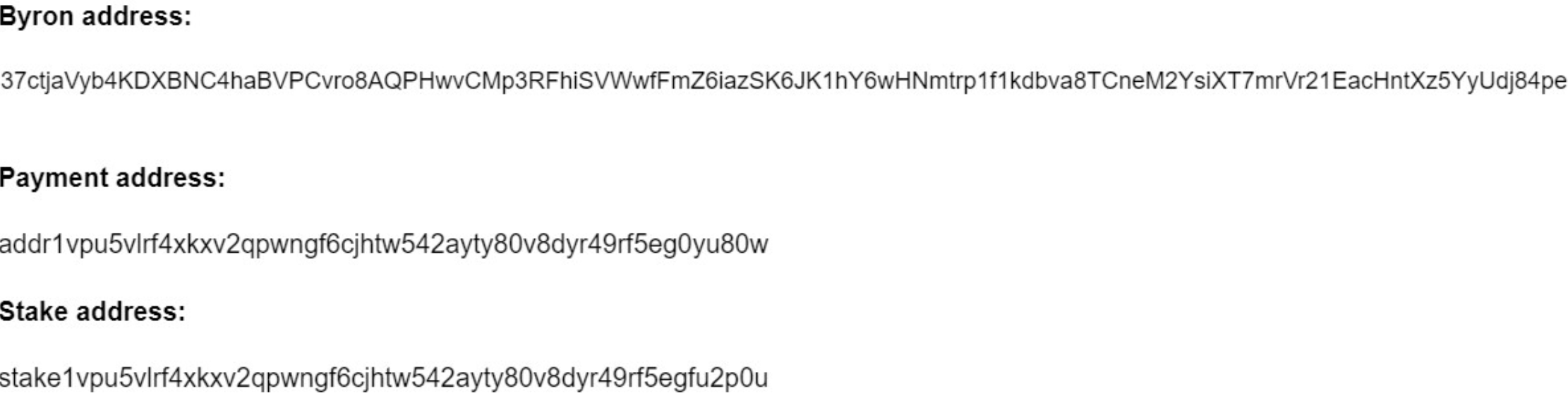 - Byron address: Byron 주소로 접두사가 없고 Base58로 인코딩되어있다.