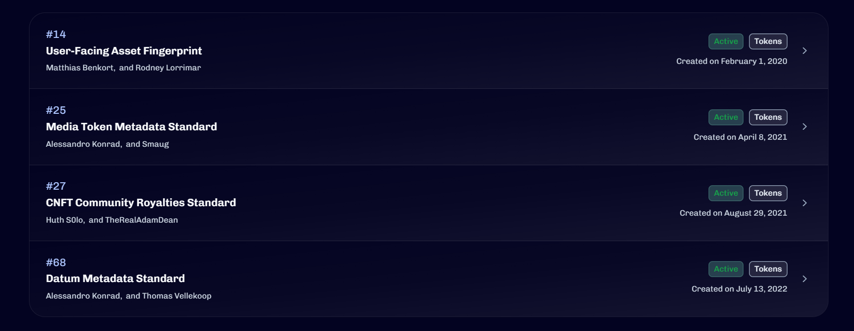 CIP-14, CIP-25, CIP-27, CIP-68는 카르다노의 개선 제안(CIP)에서 token으로 분류되는 것으로, 모두 active 상태기 때문에 알아두면 카르다노 Native token의 표준을 이해하는데 도움이 된다.