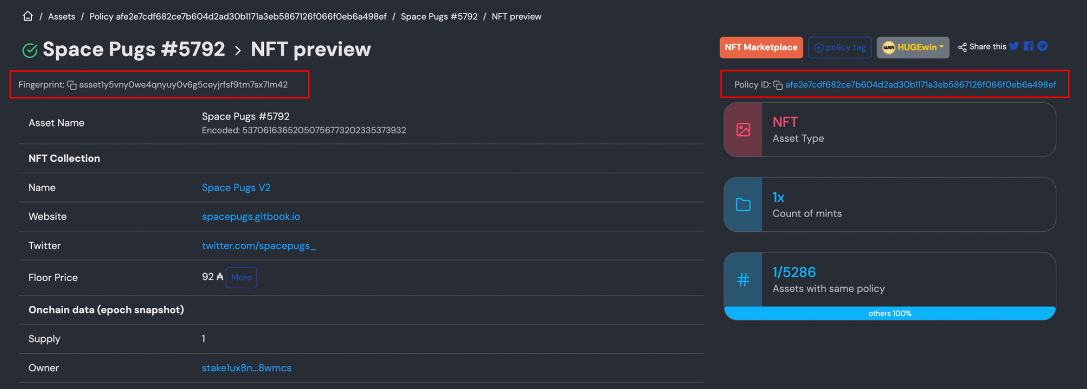 ceplorer에서 임의로 찾은 NFT로, 나와 전혀 관계없음. 위 그림에서 보면 Fingerprint와 policy id를 확인할 수 있다.