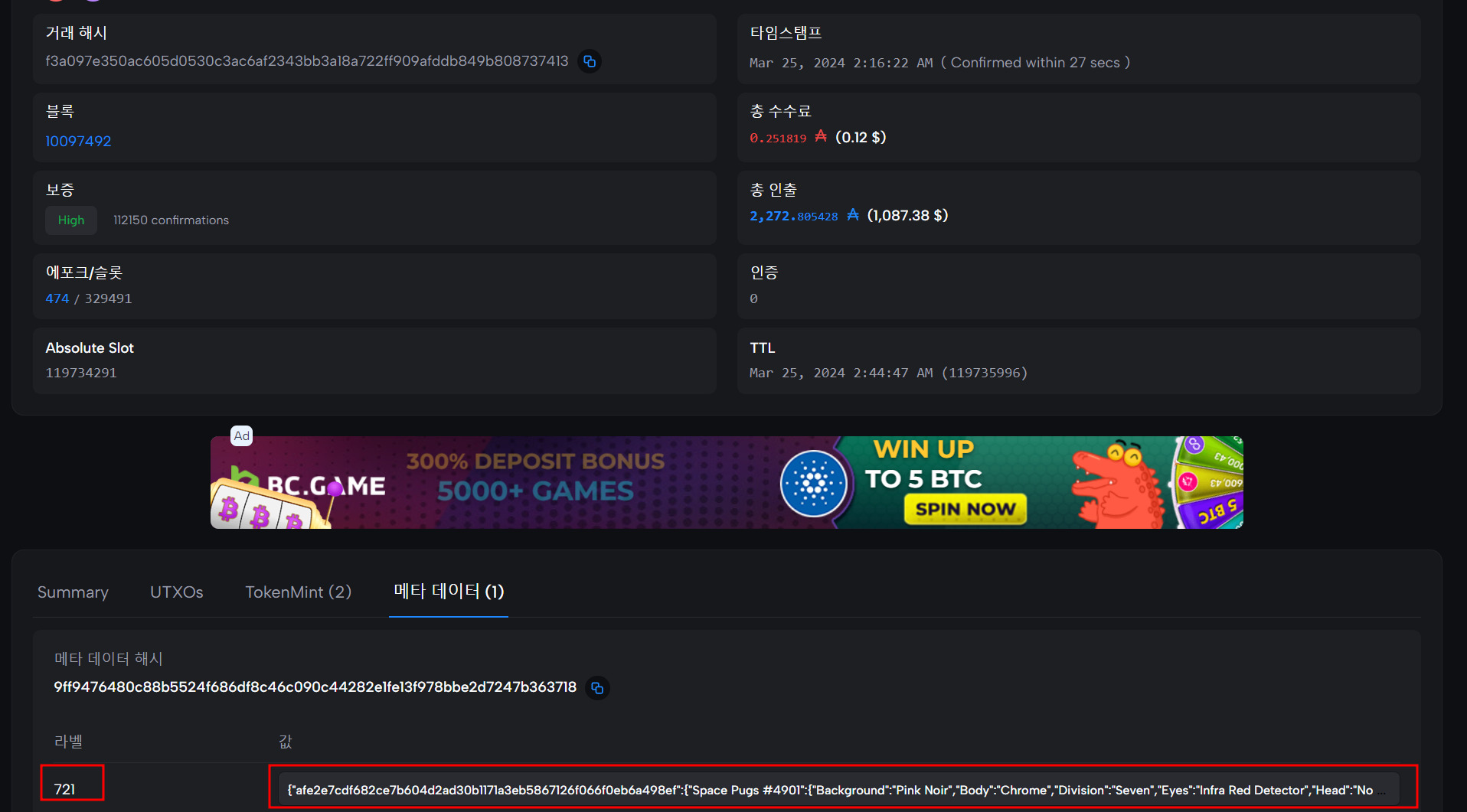 위 Space Pugs는 CIP-0025로 발행되었기 때문에, 메타데이터를 확인하려면 발행했던 트랜잭션의 메타데이터를 봐야 한다. 위 링크를 들어가면 Space Pugs의 #4901과 #5792 가 같이 발행된 것을 알 수 있으며, 아래와 같은 메타데이터를 721 label기준으로 확인이 가능하다.