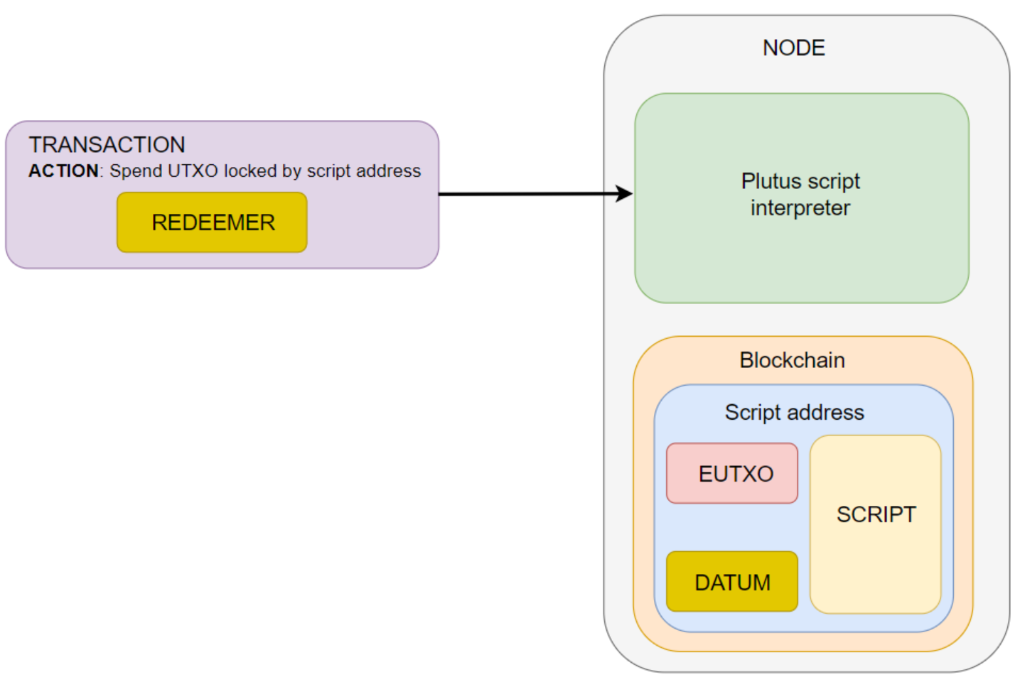 스크립트는 EUTXO를 사용하는 트랜잭션에 권한이 있는지 여부를 결정하는 코드 조각으로, 트랜잭션 유효성 검사를 위해 노드는 스크립트를 번역하고 실행할 수 있는 Plutus script interpreter를 호출한다. Interpreter는 UTXO가 잠긴 주소로 해시가 형성된 스크립트를 실행하게된다.
