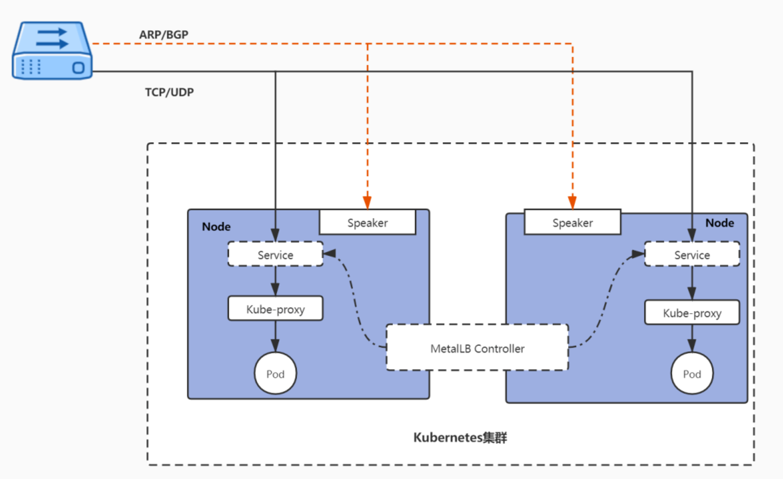 반면, Speaker는 실제 네트워크 작업을 수행하며, 클러스터 내에서 트래픽을 라우팅하거나 브로드 캐스트하는 역할을 담당한다. 즉, ARP 요청(IPv4) 또는 NDP 요청(IPv6)에 응답하여, 서비스에 할당된 IP 주소를 네트워크에 광고한다.